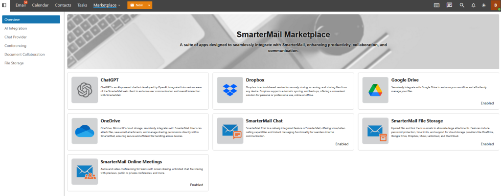 The Marketplace is a new feature that brings together various add-ons in one convenient location. It includes existing integrations such as SmarterMail Chat, SmarterMail Online Meetings, and Google Drive, along with new offerings like ChatGPT (using your own API key).