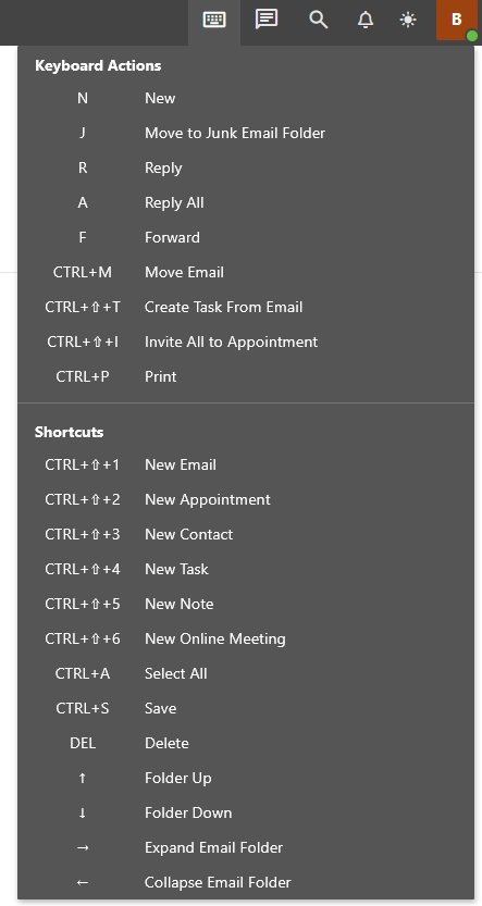 The bindings can be viewed from the webmail toolbar by clicking the keyboard icon: